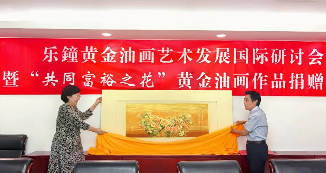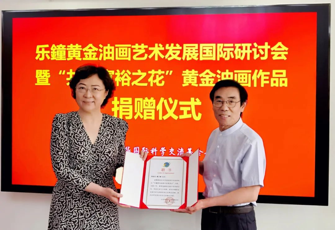 为贯彻习近平总书记关于美术工作的重要讲话精神,促进美术、艺术、科学、技术相辅相成、相互促进、相得益彰,2022年6月27日,中华国际科学交流基金会举行了“乐鐘黄金油画艺术发展国际研讨会”暨《共同富裕之花》黄金油画作品捐赠仪式。