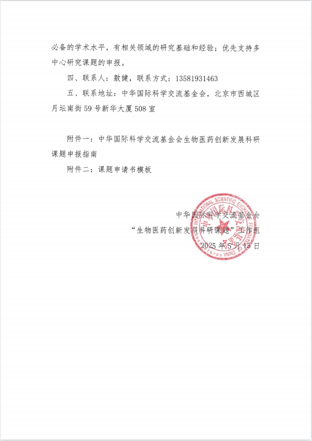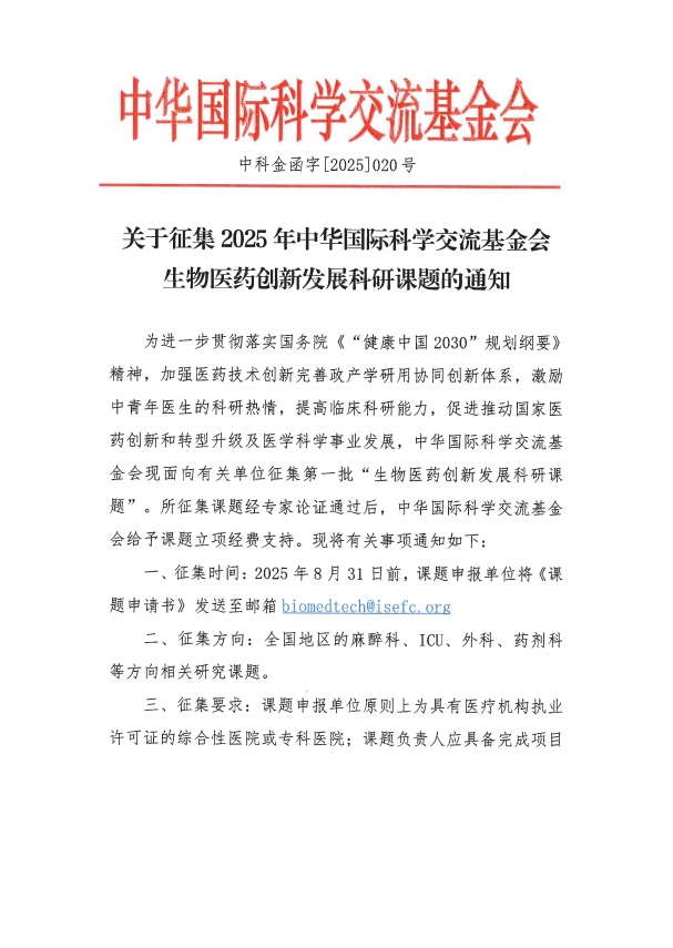 为进一步贯彻落实国务院《“健康中国 2030”规划纲要》精神,加强医药技术创新完善政产学研用协同创新体系,激励中青年医生的科研热情,提高临床科研能力,促进推动国家医药创新和转型升级及医学科学事业发展,中华国际科学交流基金会现面向有关单位征集第一批“生物医药创新发展科研课题”。所征集课题经专家论证通过后,中华国际科学交流基金会给予课题立项经费支持。现将有关事项通知如下: