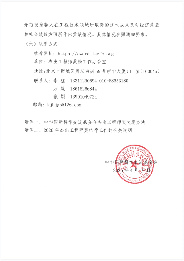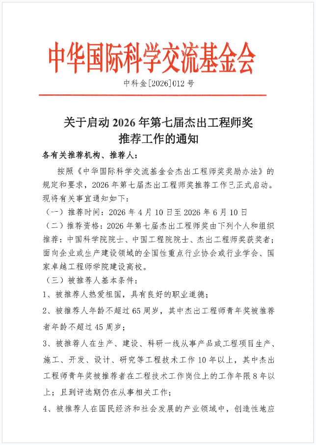 中华国际科学交流基金会关于启动2026年第七届杰出工程师奖推荐工作的通知 Attachments: 附件一中华国际科学交流基金会杰出工程师奖奖励办法.doc[ ]30 kB 附件二2026年杰出工程师奖推荐工作的有关说明.doc[ ]26 kB 下一页